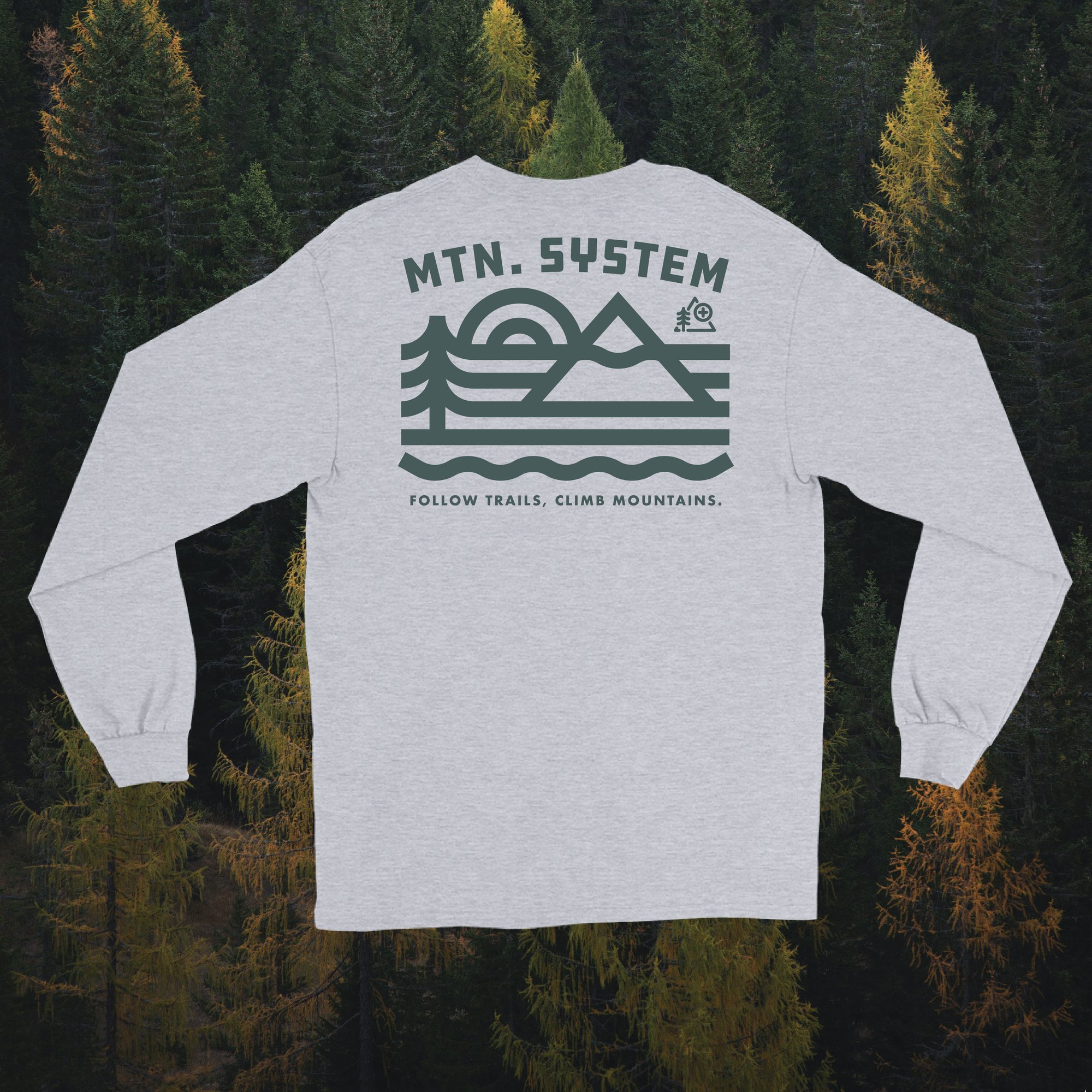Image shown is of back design. Garment also has Mtn. System logo on front left chest.