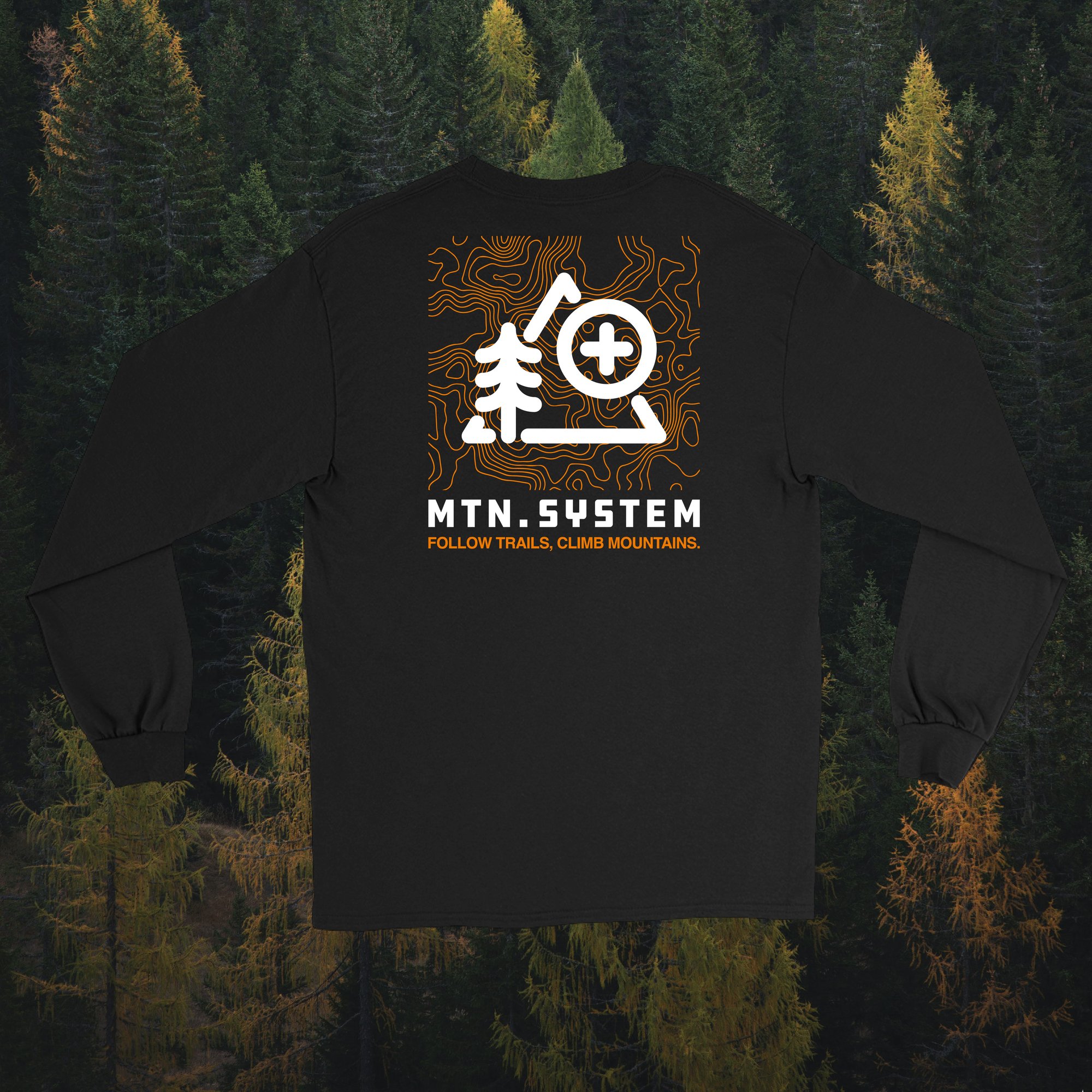 Image shown is of back design. Garment also has Mtn. System logo on front left chest.